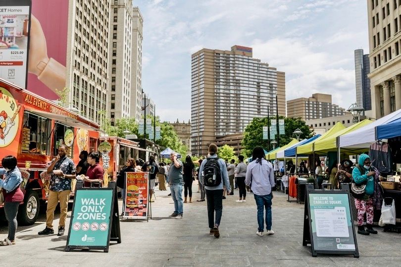 Public spaces adjacent to Campus Martius became the first beneficiaries of its increased energy as initially sketched out in the 2013 LQC plan. Cadillac Square was once the site of a historic marketplace but, even when Campus Martius began to thrive in the 2000s, it remained an improved but underutilized space. Over the past decade, much of the success of the space has been the return of its use as a marketplace for food trucks and local vendors in the summer and its role as a major holiday market. Plans to create a new permanent marketplace in the square are underway.