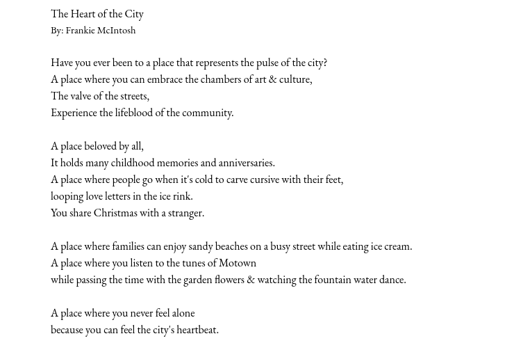 In the following poem, Detroit native and award-winning poet Frankie McIntosh describes beautifully how Campus Martius is the heart of Detroit and how it impacted her life and those of many others.