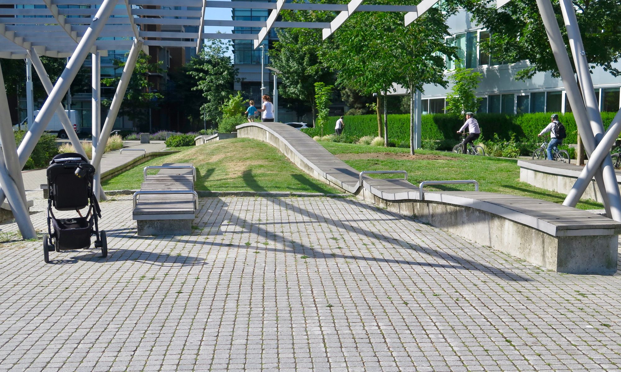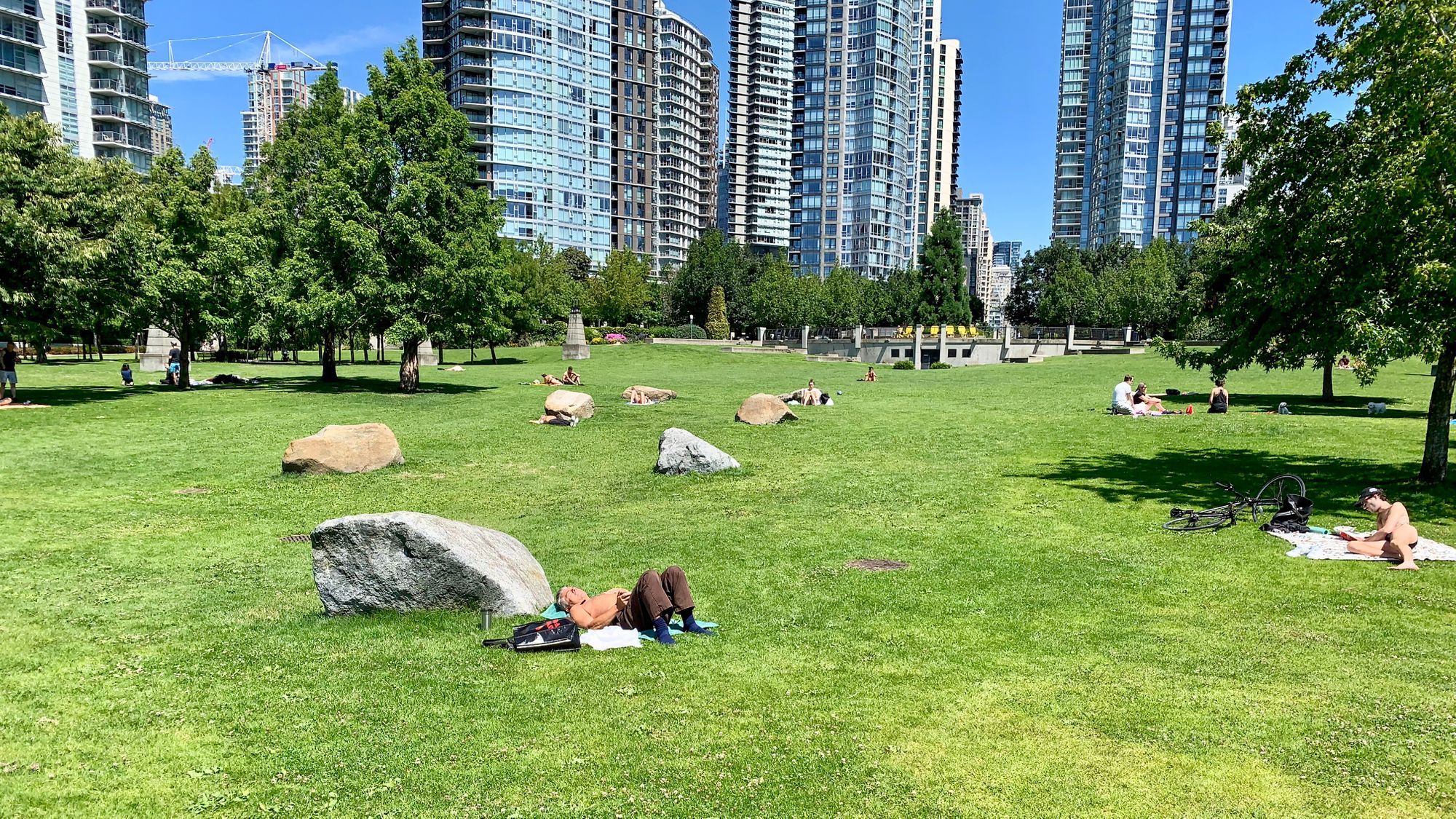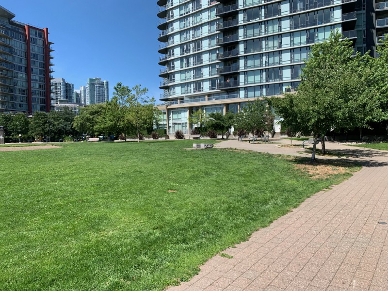 The limited public spaces that do exist on the north side of False Creek are woefully underused. Boulders placed throughout grassy areas may accommodate sunbathers, but stymie more active uses like soccer, making it boring for many families and young people. Nearby townhouses and towering apartment buildings prioritize green space in their surroundings, but not active space—meaning that these are aesthetic choices that do not meaningfully support social life in the area.