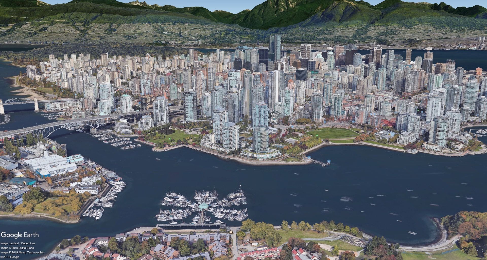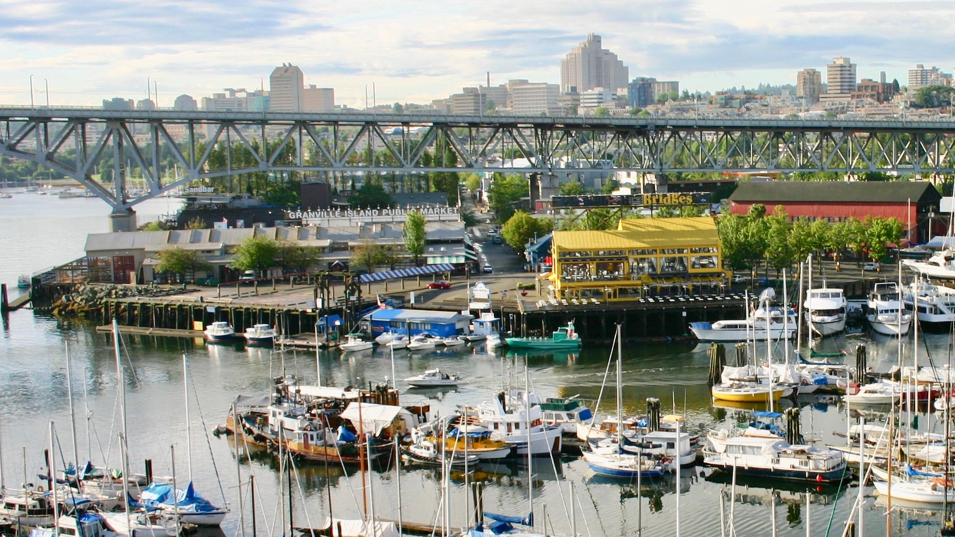 Davie Street in Vancouver (left) and Granville Island in the foreground of the north side of False Creek (right).