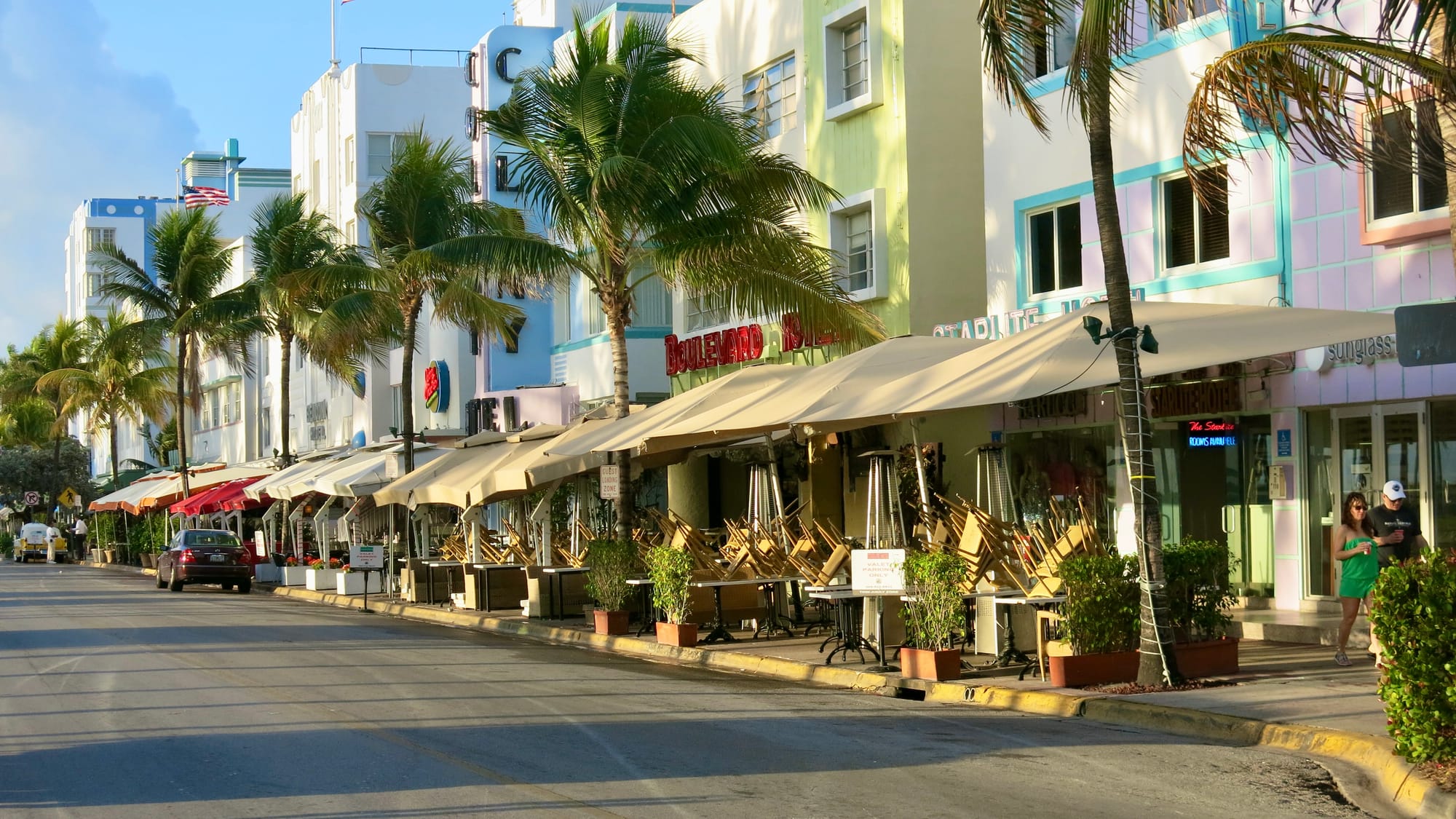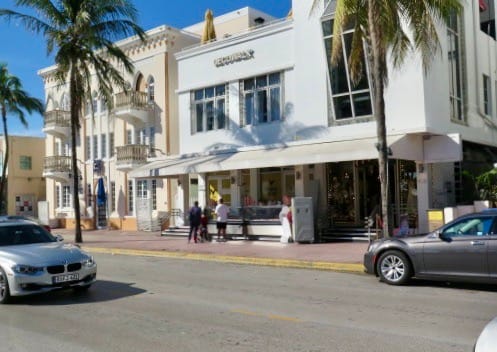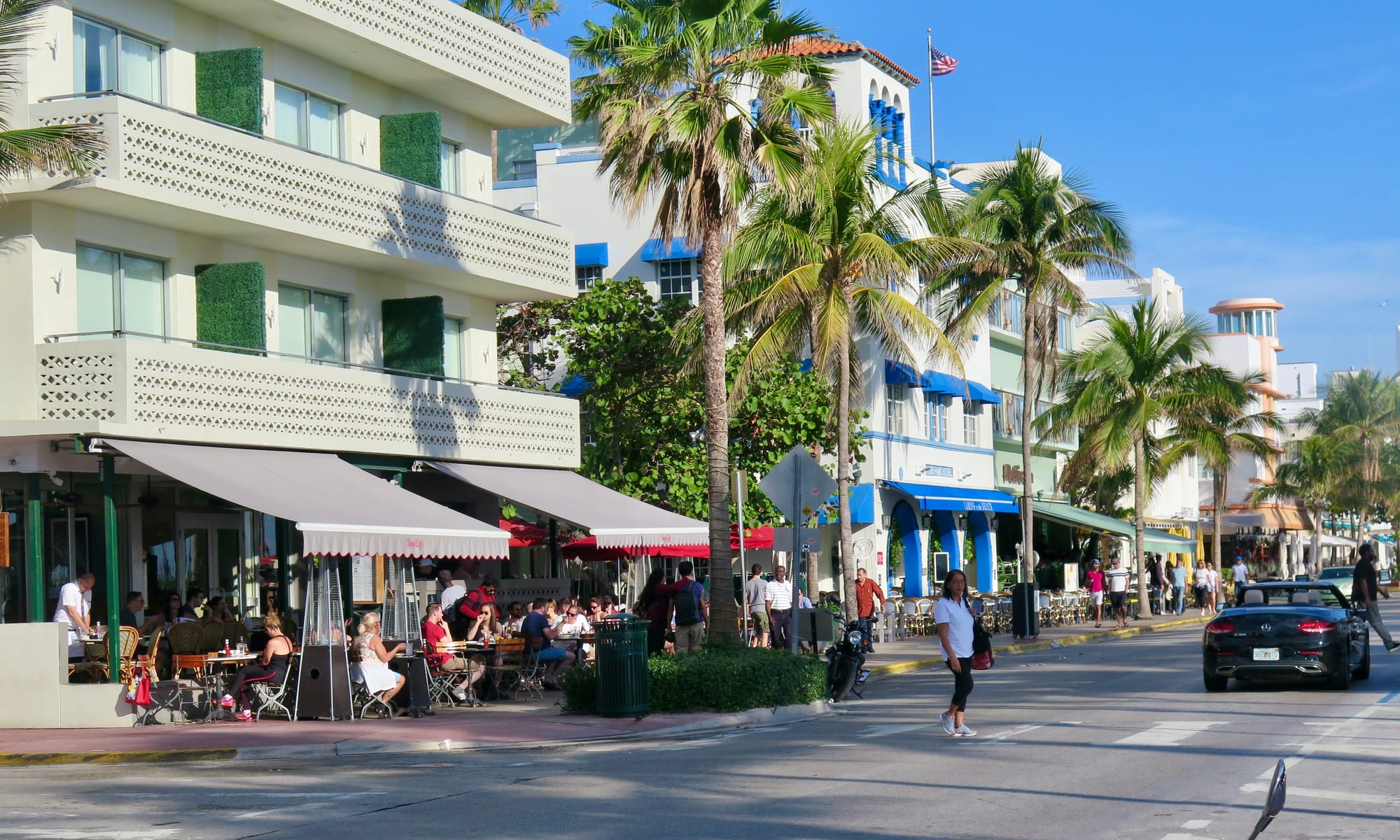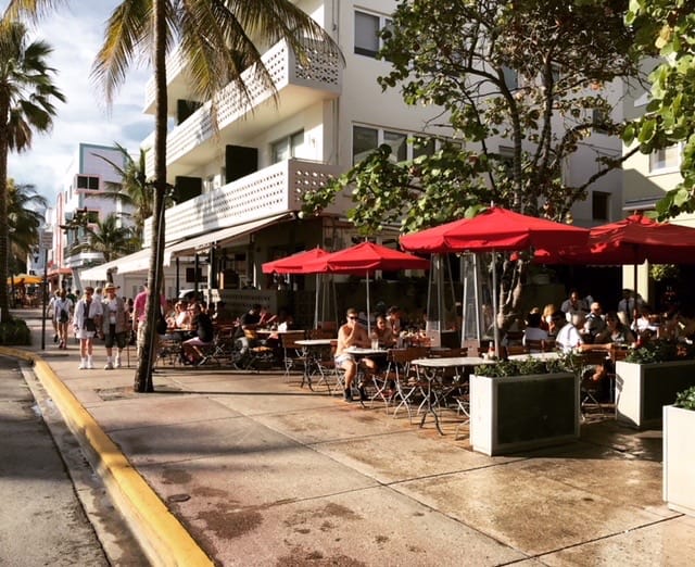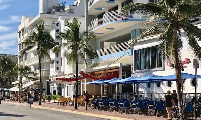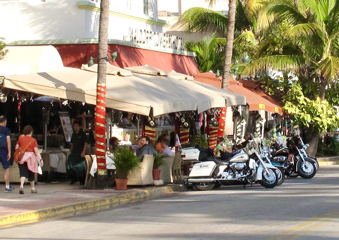 With Art Deco buildings lining Ocean Drive on one side and a park and beach on the other, Ocean Drive in Miami Beach is a place to see and be seen as traffic creeps along the busy thoroughfare. Most of the Art Deco hotels that face Ocean Drive have porches to view the passing visitors.