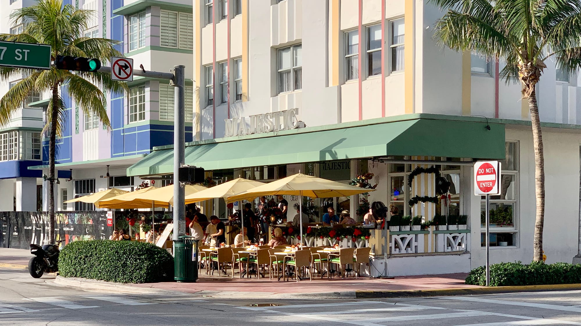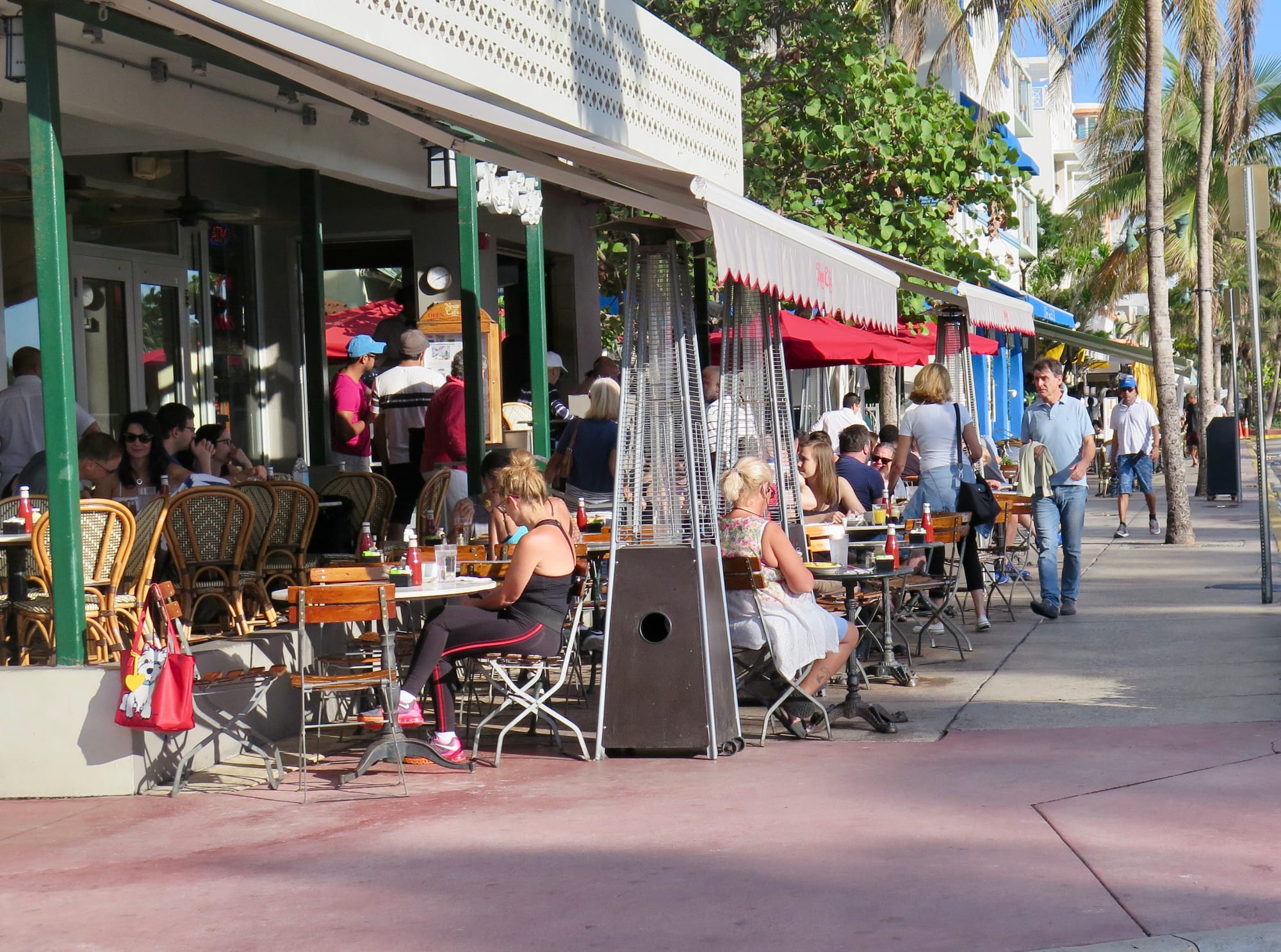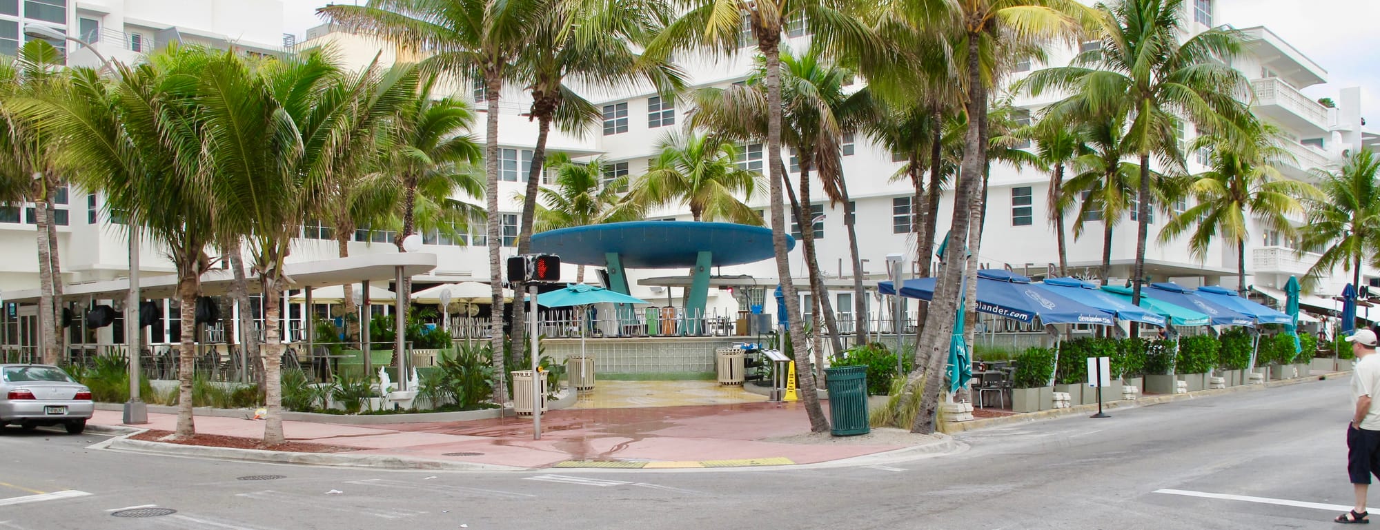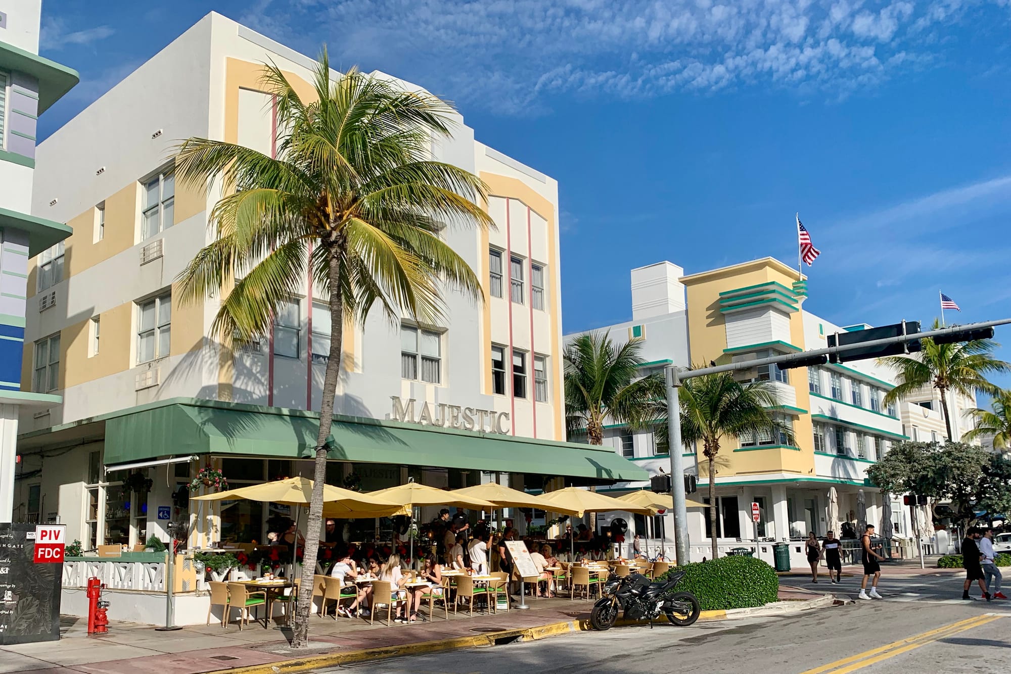 With Art Deco buildings lining Ocean Drive on one side and a park and beach on the other, Ocean Drive in Miami Beach is a place to see and be seen as traffic creeps along the busy thoroughfare. Most of the Art Deco hotels that face Ocean Drive have porches to view the passing visitors.