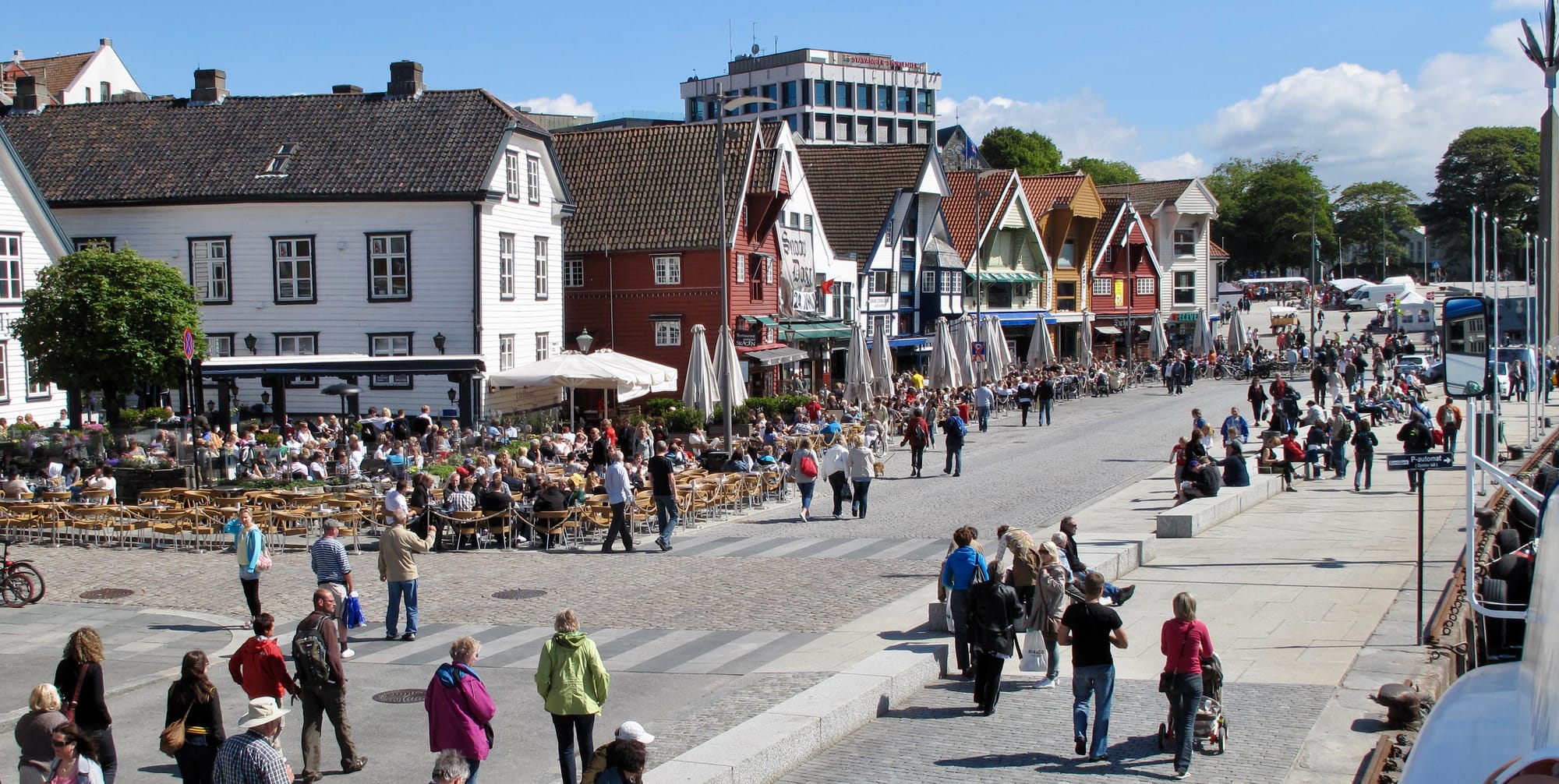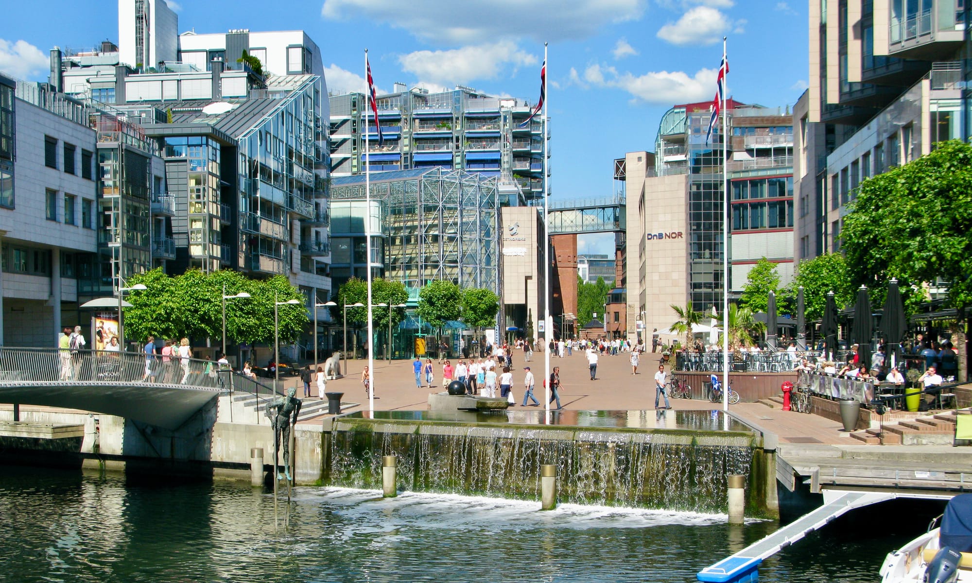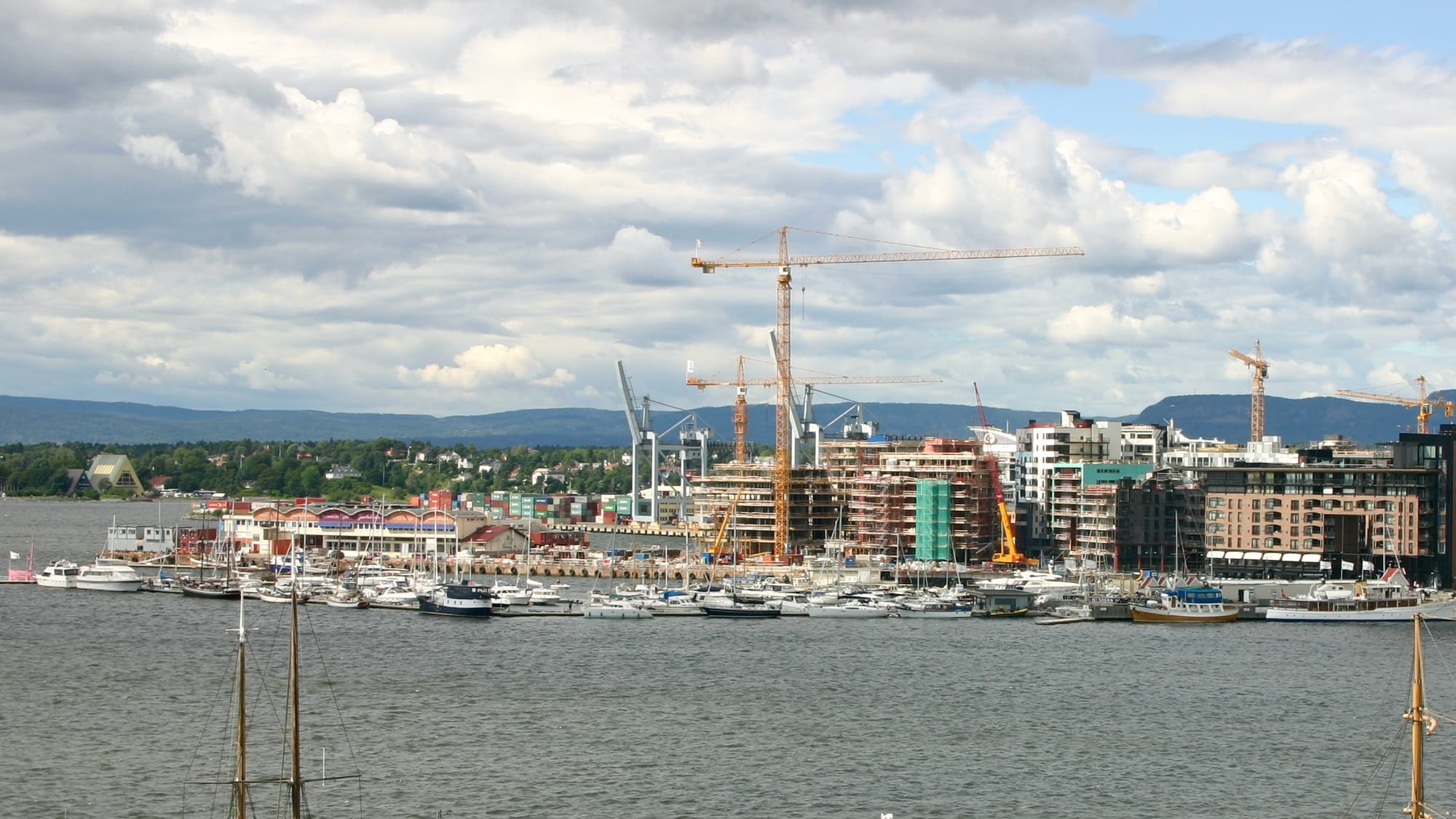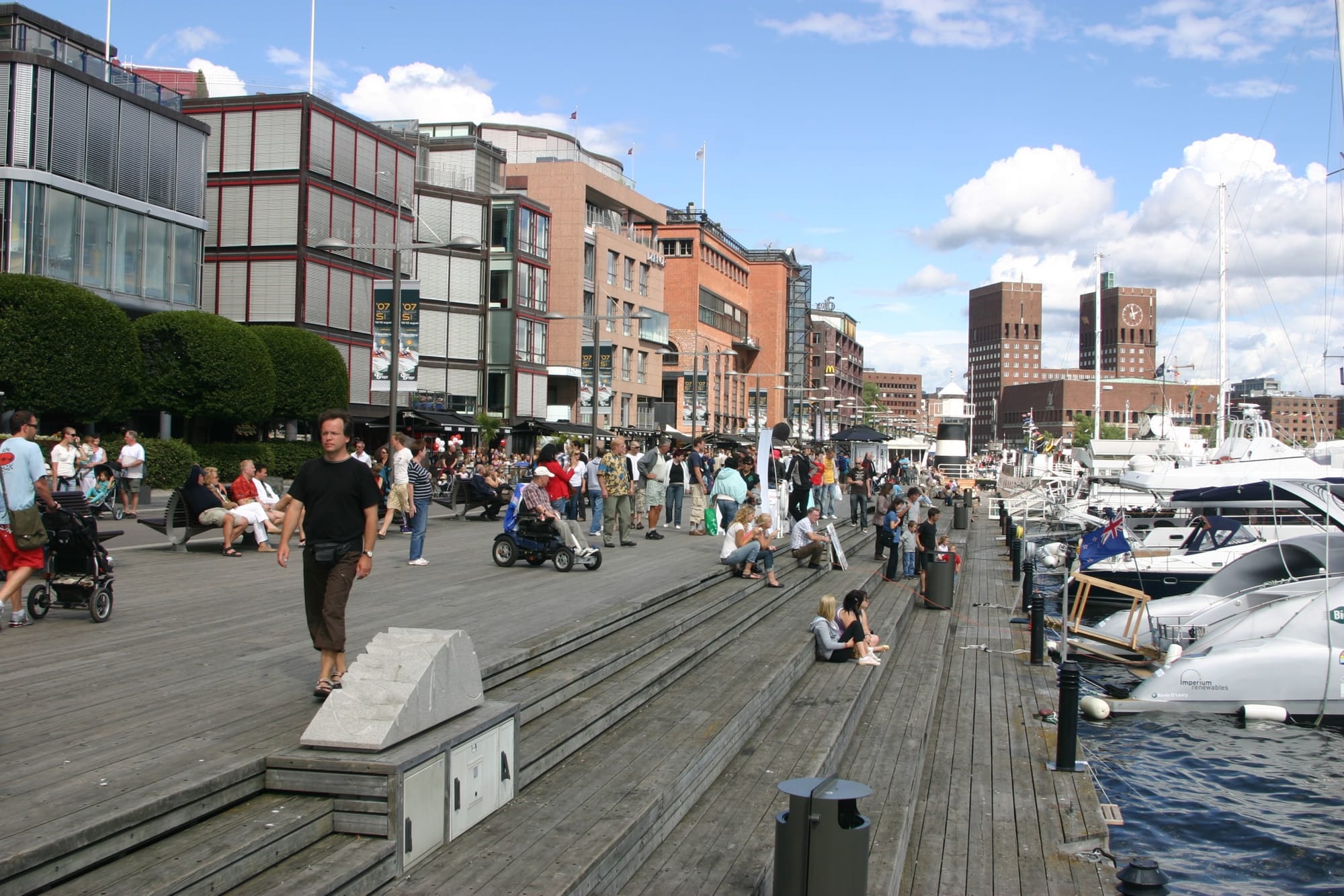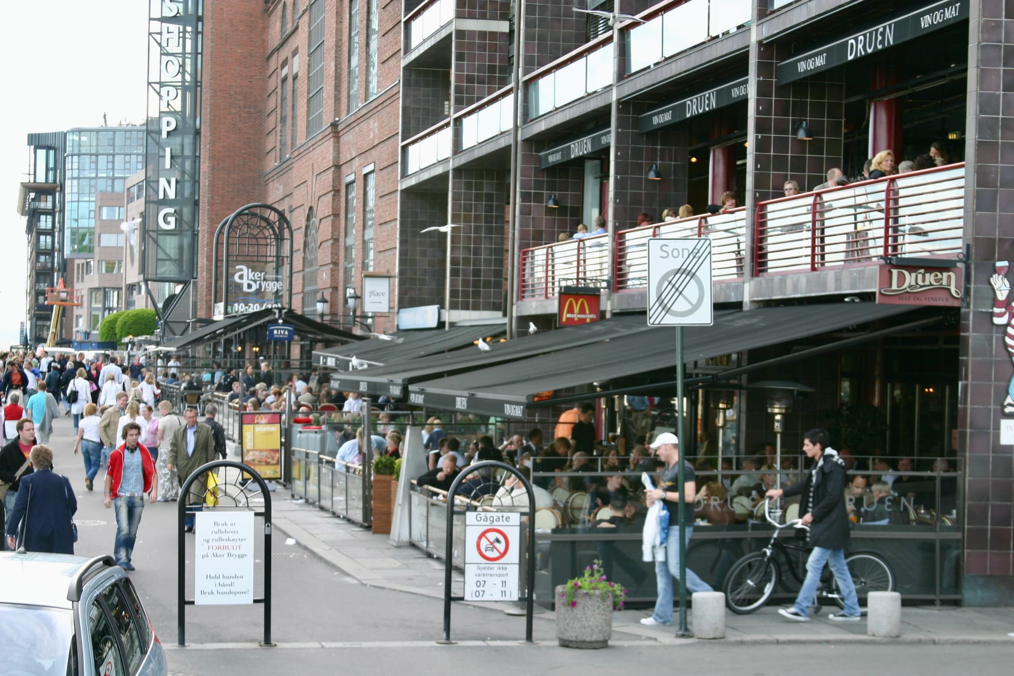 So can higher density work at the waterfront? There are a few situations in which it can. Akker Brigge in Oslo has a development with eight-story residential mid-rise buildings, but they also have very wide walkways that are used for pedestrian-only public spaces. Higher density works here because the width/height ratio of public space to buildings is balanced.