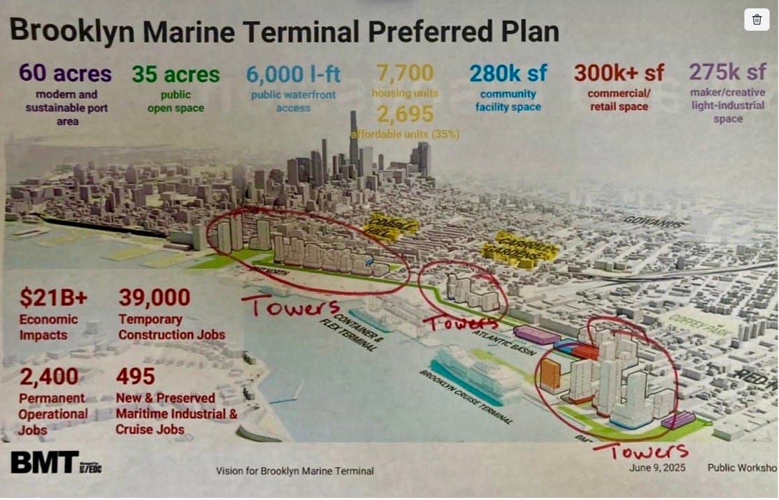 Brooklyn is not a great waterfront city on anyone's list. There is no vision, standout amenities, or significant destinations. Except for the Statue of Liberty, Brooklyn Bridge, and Jane's Carousel which are landmarks that people marvel at. There is little at the waterfront to draw people in, especially compared to other great waterfronts around the world. The Brooklyn Marine Terminal Plan attempts to work on this underperforming waterfront, yet the proposal it lays out threatens to make it even worse. We can't let this happen.