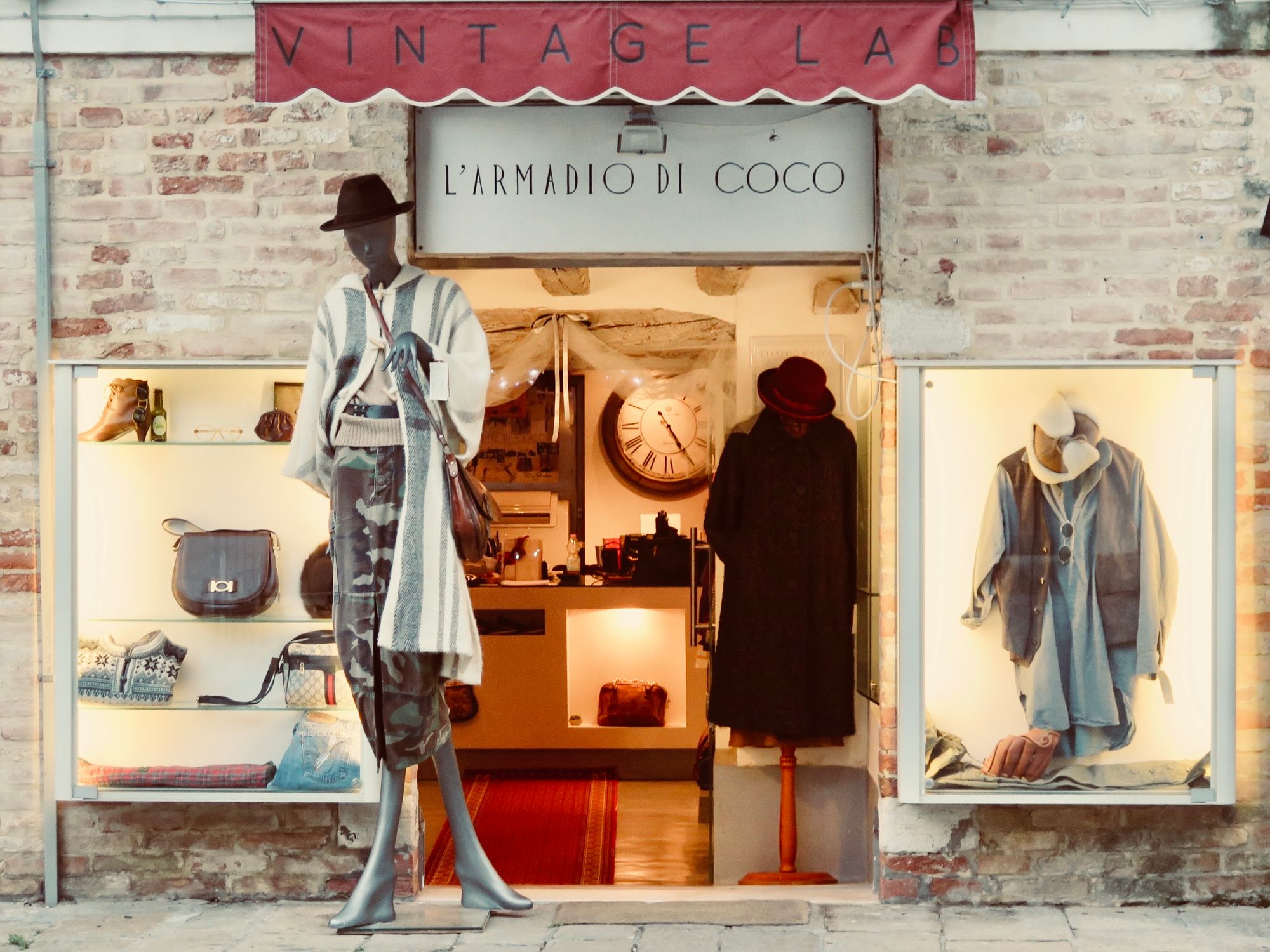 These outdoor displays of indoor goods create an ambiance that gives a stronger identity to stores than just window displays do. They make people want to stop, take a closer look at the outfits, and maybe even pop into the store to see more.