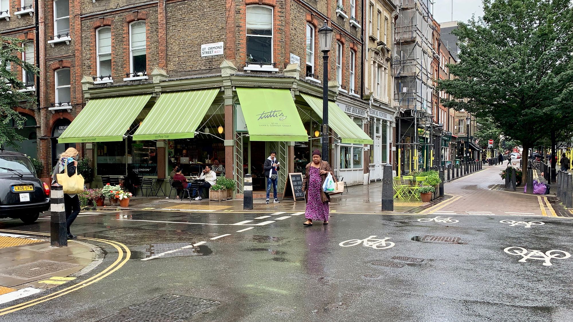 We see similarly lively sidewalk life pouring out of buildings inside-out style in Amsterdam and London.